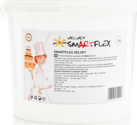 Eine weiße, besonders flexible Paste mit ausgezeichneten Eigenschaften, besonders geeignet für das Überziehen von Torten und das Modellieren von Figürchen. Sie ist beim Modellieren und Überziehen sehr elastisch, klebt nicht, behält schnell ihre Form und "setzt" sich auch bei größeren Objekten nicht ab. Zutaten: Zucker, Glukosesirup, Trinkwasser, pflanzliche Fette (Kokosfett, gehärtetes Palmkernöl), modifizierte Kartoffelstärke, Verdickungsmittel: Xanthan, Aroma, Konservierungsmittel: Kaliumsorbat, Säureregulator: Zitronensäure Nährwert pro 100 g: Energie 1641 kJ/388 kcal, Fett 6,26 g (davon gesättigt 5,29 g), Kohlenhydrate 82,41 g (davon Zucker 73,23 g), Ballaststoffe 0,99 g, Eiweiß <0,2 g, Salz <0,03 g