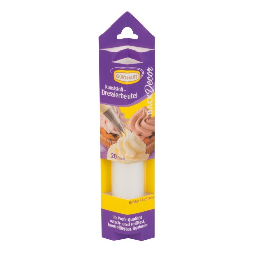 Einweg-Dekorationsbeutel erleichtern Ihnen die Arbeit beim Dekorieren von Torten, Cupcakes, Makronen, aber auch von allerlei herzhaften Snacks. Der Dekorierbeutel hat ein vorgefertigtes Loch zum Dekorieren, oder Sie können eine geeignete Dekorierspitze verwenden. Nach dem Gebrauch einfach im sortierten Abfall entsorgen. Packung mit 20 Stück im Format 65 x 42 x 288 mm.