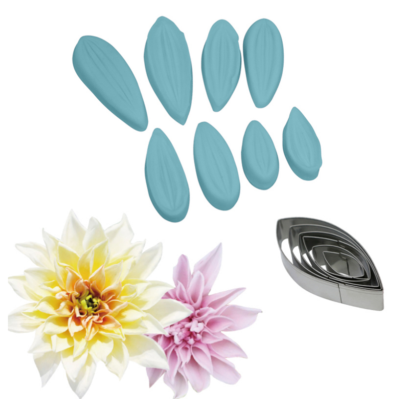 Mit Hilfe dieses Prägewerkzeugs und der Ausstechformen können Sie perfekte Dahlien mit Blüten und Blättern aus Marzipan, Fondant oder Modellierschokolade herstellen. Giclee-Stift und Ausstecher