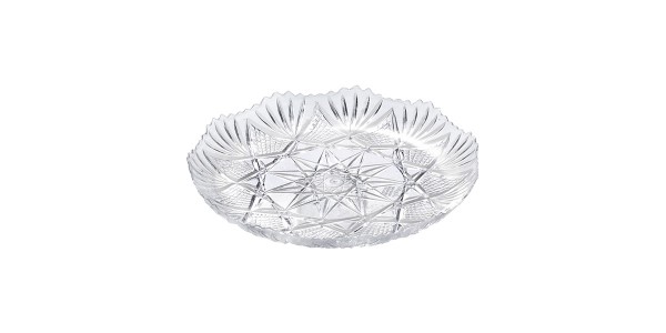 Transparentes Tablett mit eingraviertem Dekor auf der Vorderseite und am Rand, ideal zum Servieren von Süßigkeiten und Desserts. Erhältlich in verschiedenen Größen.