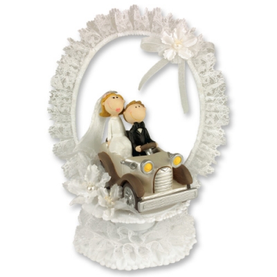 Unverze dekorace in Form eines Brautpaares, das in einem Auto sitzt. Die Braut und der Bräutigam sind in klassischen Farben dargestellt, sie tragen einen schwarzen Anzug bzw. ein weißes Brautkleid. Die Abmessungen der Figur betragen 18 x 220 mm. Die Statue kann auf einer mehrstöckigen, unkonventionellen oder auch ganz einfachen Hochzeitstorte verwendet werden. Keine aufwändige Vorbereitung nötig. Dank eines festen Sockels wird sie genau an ihrem Platz bleiben. Die Figur besteht aus robustem Kunststoff, versehen mit zartem Tüll, ist gesundheitlich unbedenklich und gut zu reinigen.