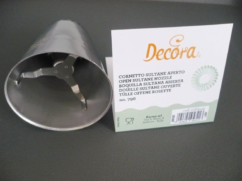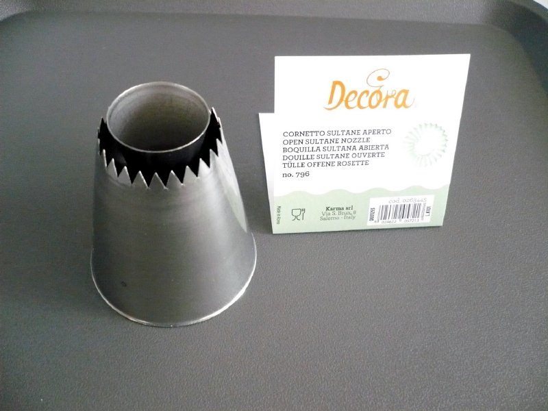 Die Metall-Süßwaren-Dekorspitze 796 eignet sich für Sultaninen und Baisers. Mit ihr lassen sich garantiert präzise und regelmäßige Formen herstellen. Die Spitze kann wiederholt mit dem Dekorationsbeutel verwendet werden. Sie ist aus rostfreiem Stahl gefertigt, es bleiben keine Fettflecken auf der Oberfläche zurück. Nicht spülmaschinenfest.
