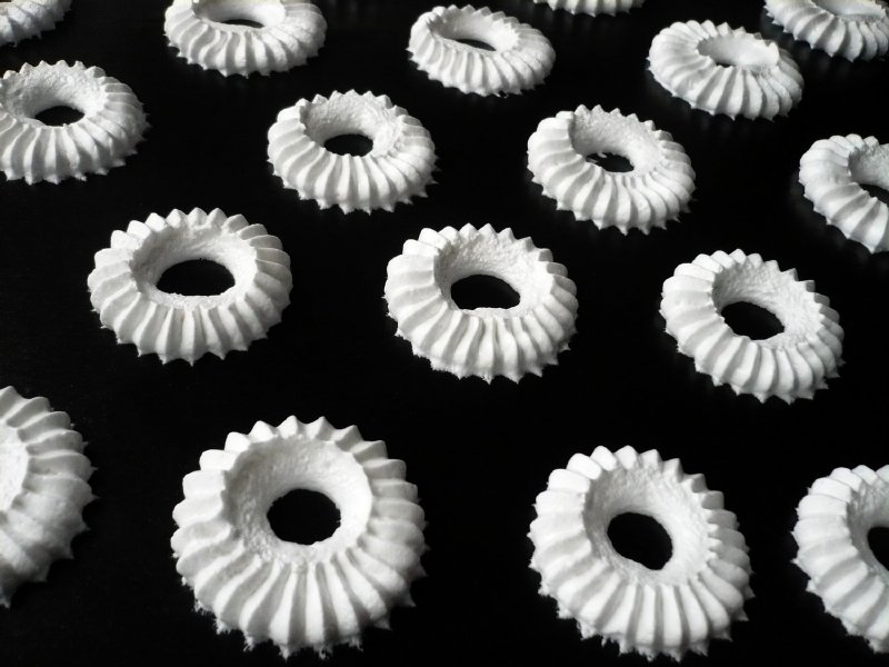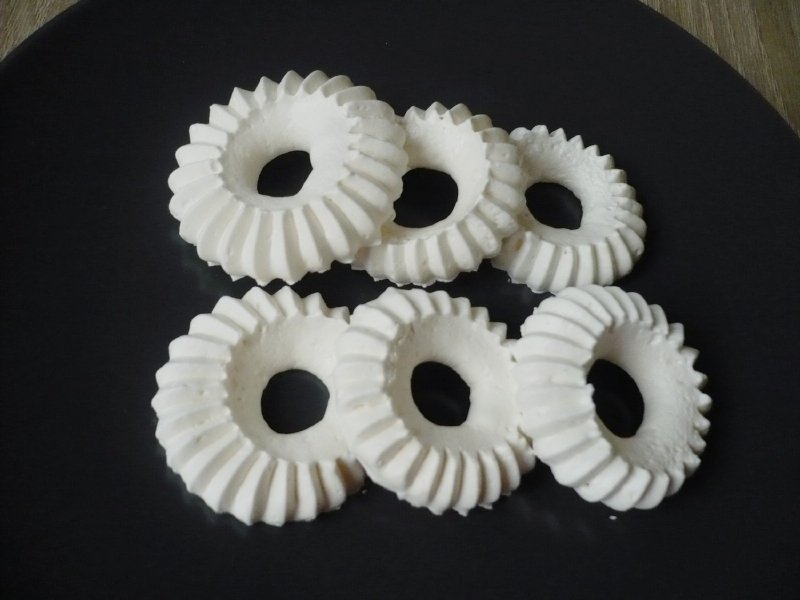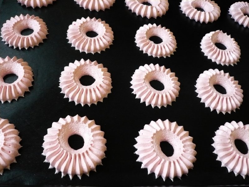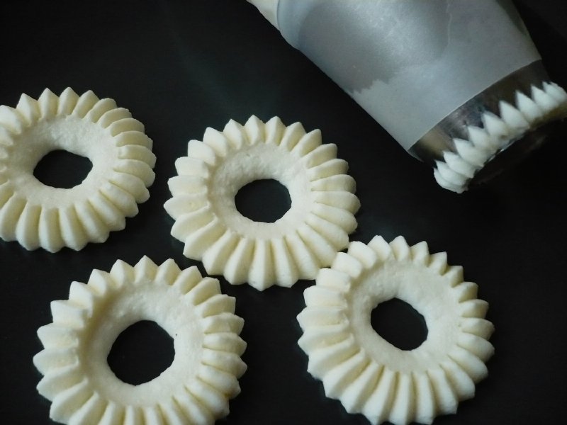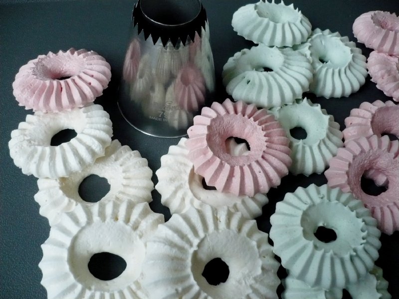 Die Spitze ist robust, sehr stark und sehr einfach zu benutzen. Sie wird in einem Dekorationsbeutel geliefert, ich mochte den Silikonbeutel. Die vorbereitete Schneemasse wird dann in den Beutel gegeben. Die Teflonfolie auf das Backblech legen, aber damit sich die Folie bei der Zubereitung der Baisers nicht löst, empfehle ich, das Backblech zuerst ganz leicht mit Wasser zu bepinseln, die Folie darauf zu legen und anzudrücken. Die Folie bleibt dann am Blech haften und lässt sich leichter und schneller verarbeiten. Legen Sie die Spitze senkrecht auf das Blech mit der Folie und drücken Sie einen Teil der Masse aus dem Beutel, heben Sie den Beutel wieder senkrecht an und fahren Sie fort. Das Herausdrücken des Eiweißschnees ist sehr einfach. Auch Anfänger können das, und es ist alles eine Frage der Übung, um schöne und symmetrische Formen zu machen.