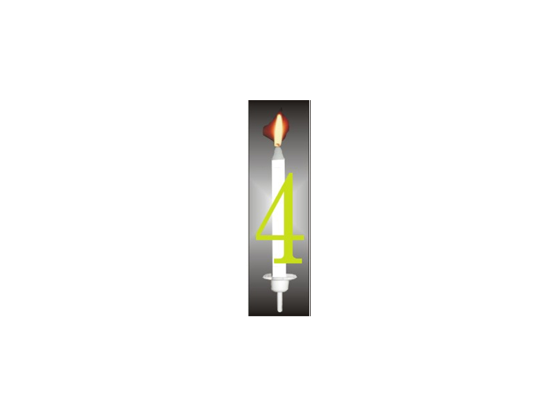 Klassische Tortenkerze mit Kunststoffdekoration in Form der neongelben Zahl vier. Die Länge der Kerze beträgt 8,8 cm, die Breite 8 mm, die reflektierende Zahl ist 4,6 x 3 cm groß. Neben der Kerze finden Sie in der Verpackung auch einen Tortenaufsatz aus Kunststoff mit einer Tortennadel.