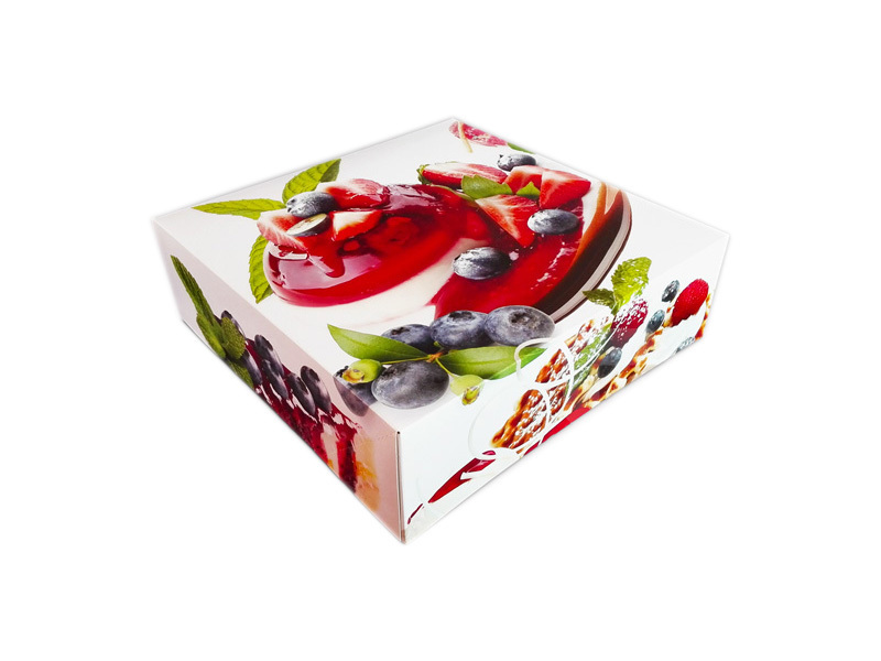 "Eine Schachtel für größere Torten und Brötchen oder für größere Mengen an Süßigkeiten oder Gebäck, aus hochwertigem Hartpapier mit Druck.