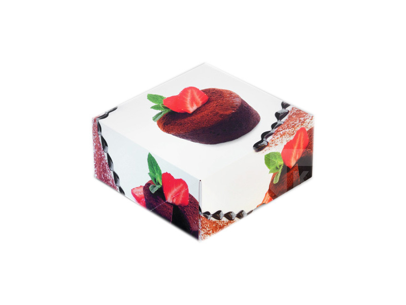 "Eine Schachtel aus hochwertigem, dickerem Papier mit Farbdruck, die für den Transport von Kuchen, Brötchen, Gebäck, Süßigkeiten und verschiedenen anderen Arten von Backwaren bestimmt ist.