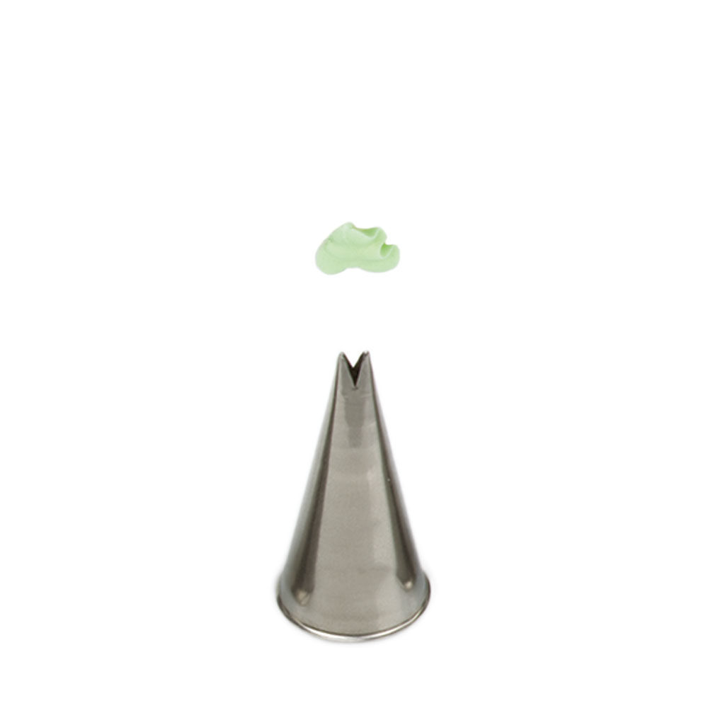 Metall-Dekorierspitze 349/352S für Blätter, mit der Sie präzise und einzigartige Dekorationen herstellen können. Die Spitze kann wiederholt mit dem Dekorationsbeutel verwendet werden. Sie ist aus rostfreiem Stahl gefertigt, es bleiben keine Fettflecken auf der Oberfläche. Nicht spülmaschinenfest.