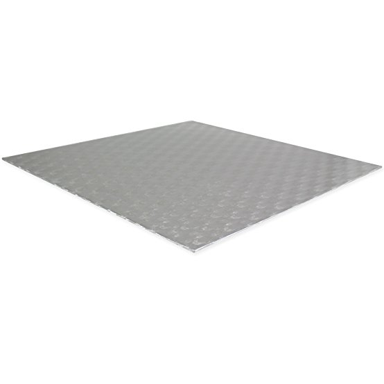 Die silberne Kuchenmatte hat eine quadratische Form. Er besteht aus hartem Karton, der mit Silberfolie beschichtet ist. Die Größe beträgt 20,3 x 20,3 cm.