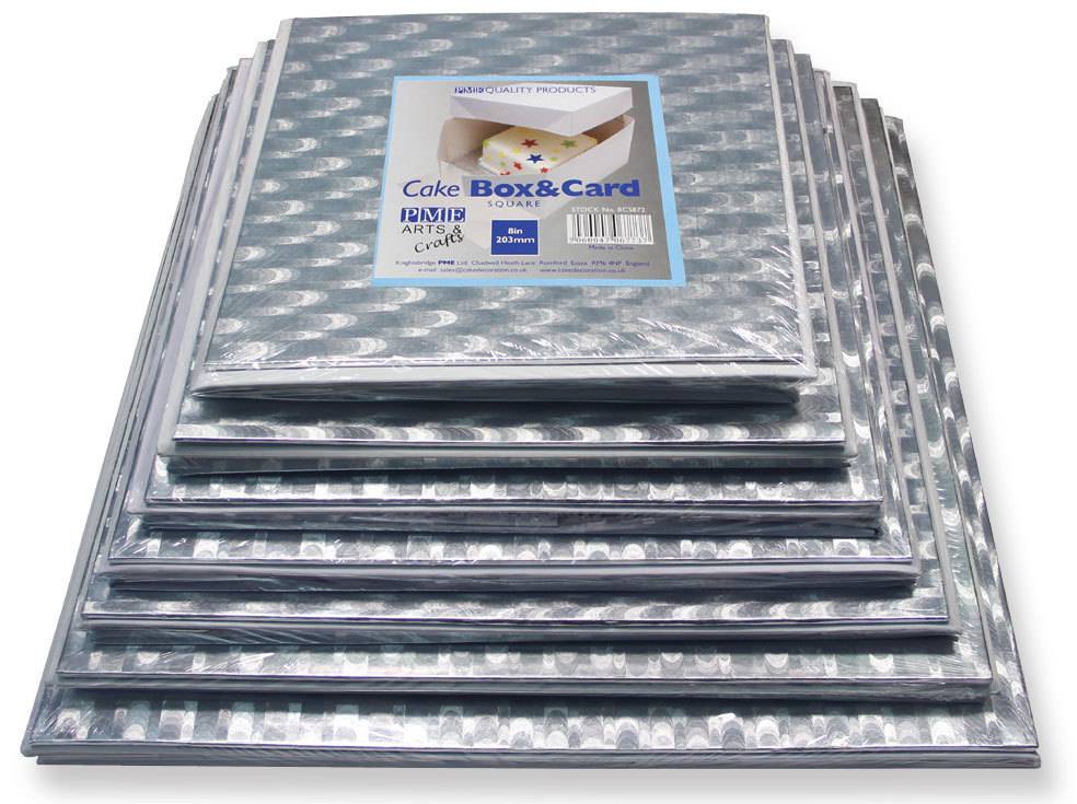 Komplettset für den einfachen Transport der Torte. Der silberglänzende Boden ist auch zum Servieren geeignet. Die Schachteln sind aus weißem Karton und werden ungefaltet geliefert. Die Matte ist mit Silberfolie überzogen.
