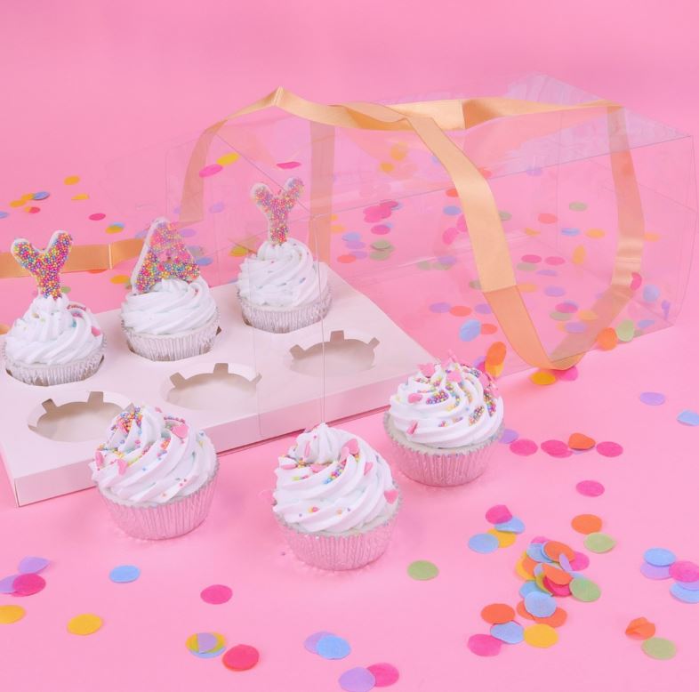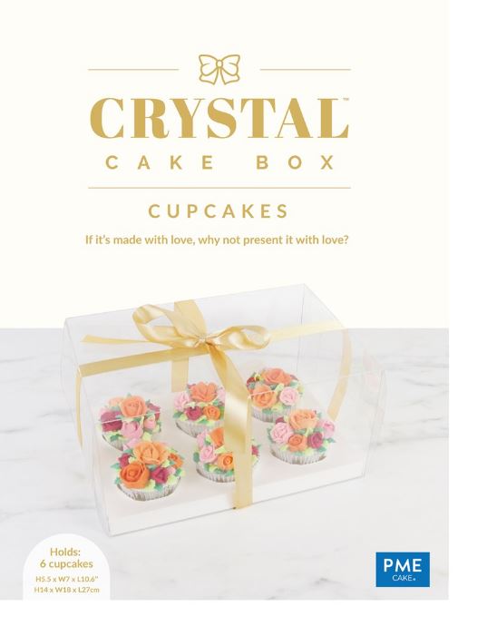 Diese schönen transparenten Cupcake-Boxen von PME sind die perfekte Art, Ihre Cupcakes zu präsentieren. Es handelt sich um eine kristallklare Cupcake-Box aus PET-Kunststoff für Rundumsicht. Die Boxen sind einzeln mit einer stabilen Einlage und goldenem Satinband verpackt. Die Box kann bei normalem Gebrauch immer wieder verwendet werden. Maße der T-Box: 14 x 18 x 27 cm. Geeignet für 6 Cupcakes.
