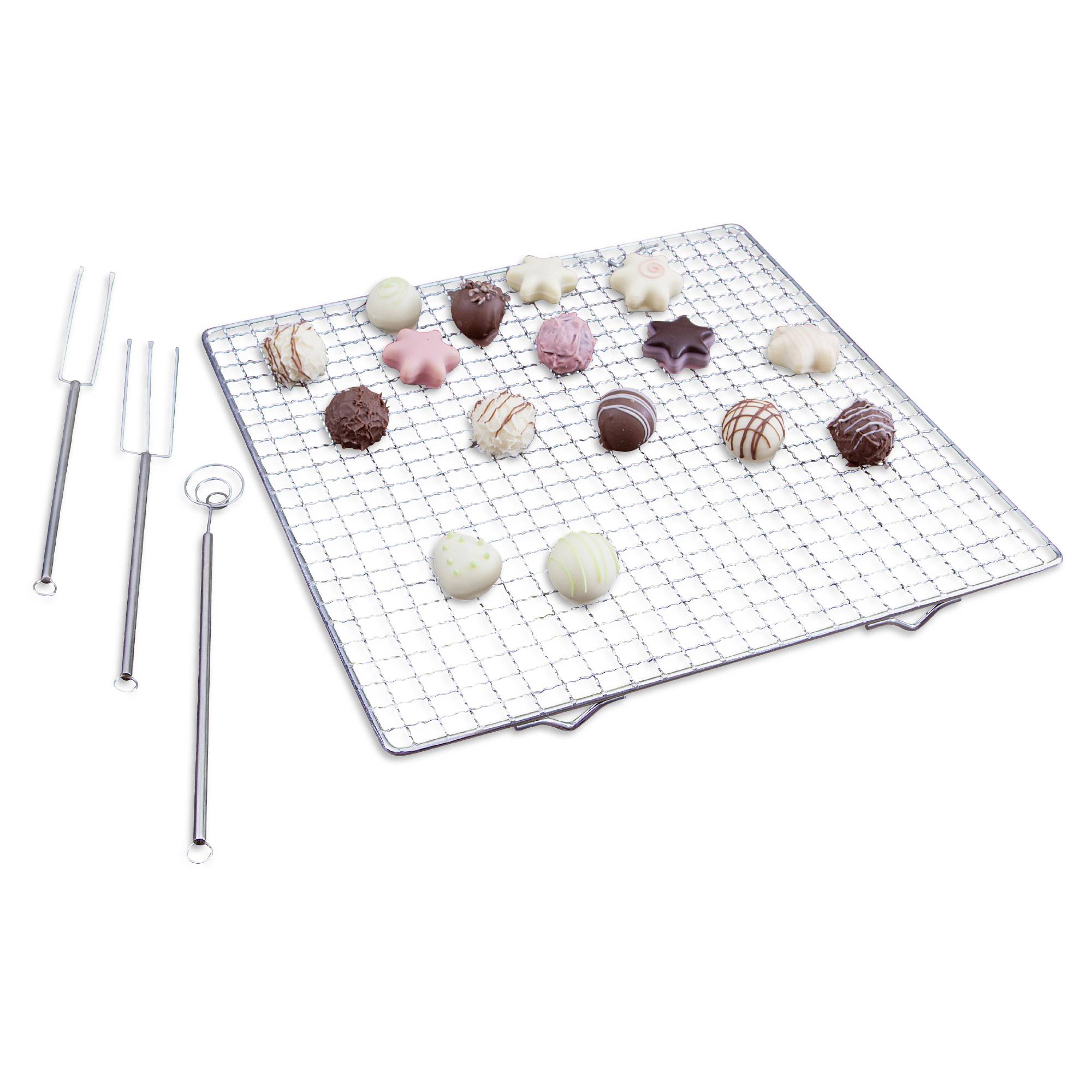 Das praktische Pralinenherstellungsset enthält ein Abtropfsieb und Utensilien. Maße des Siebs: 30 x 30 cm.