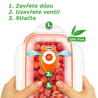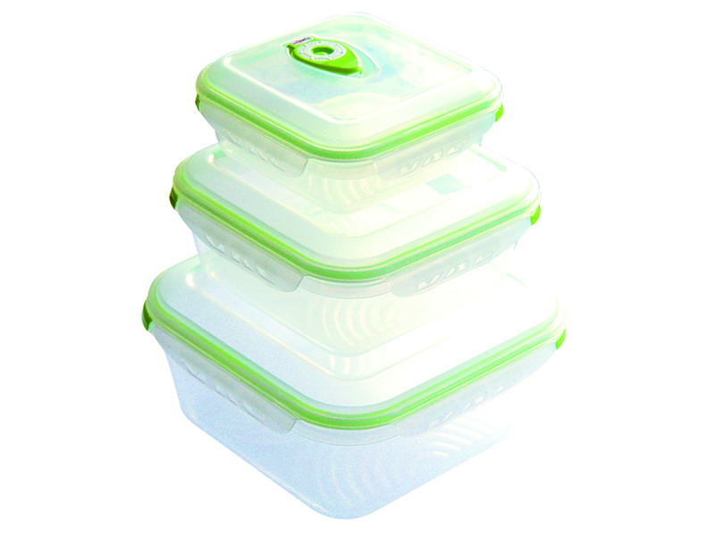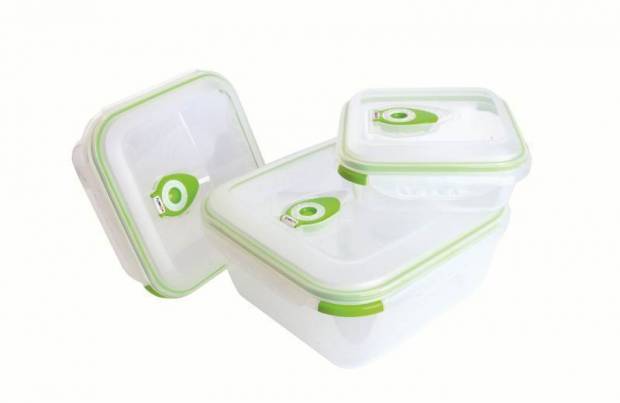 Ein Set aus drei Vakuumdosen zur Aufbewahrung von Lebensmitteln, deren Frische um bis zu 40% verlängert wird.