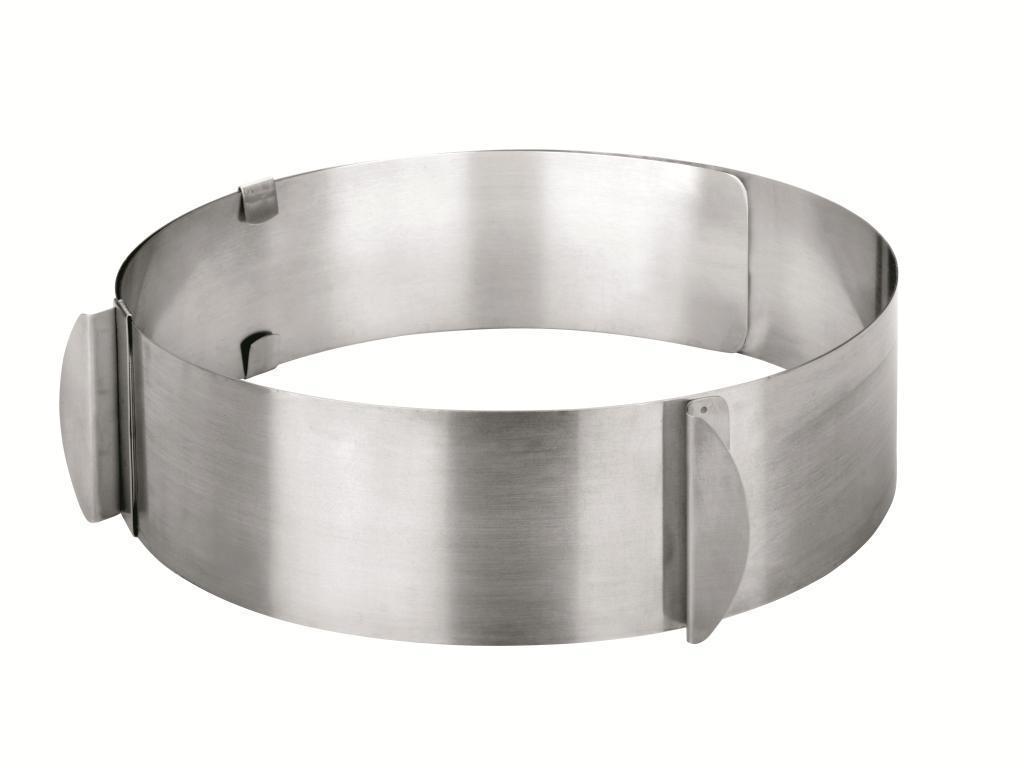 Produkt aus rostfreiem Material, das für den Lebensmittelbereich bestimmt ist. Hochwertige Form, die mit Hilfe von einzelnen Elementen im Durchmesserbereich von 16cm bis 30cm eingestellt werden kann. Die Höhe der Form beträgt 6 cm. Das Produkt kann problemlos in jeder Spülmaschine gereinigt werden.