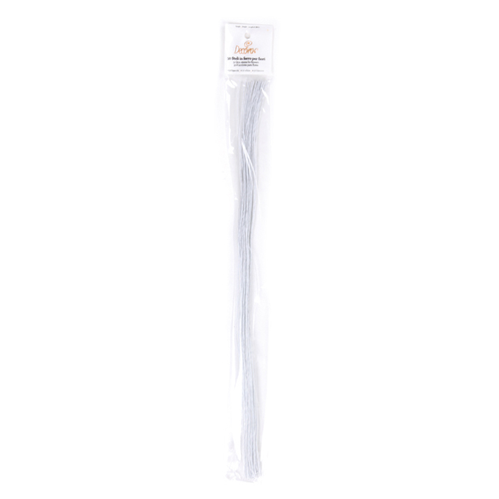 Die weißen Blumendrähte sind aus dünnem Draht gefertigt und mit Papier überzogen. Sie eignen sich zum Beispiel zum Formen von Blumen aus Gumpaste. Die Länge der Drähte beträgt 40 cm. 50 Stück.