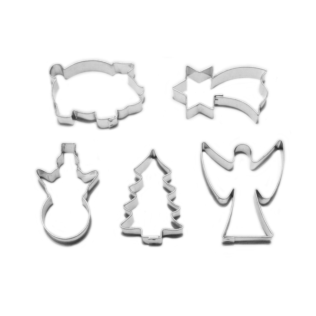 Ein kleines Set weihnachtlicher Stanzen mit fünf Motiven, darunter ein Schweinchen, ein fliegender Komet, ein Engel, ein Schneemann und ein Weihnachtsbaum. Nach dem Backen können die Lebkuchen oder andere Teige mit einem feinen Dekorator mit beliebigen Mot