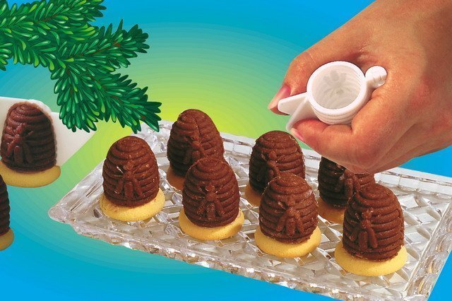 Die Form mit Teig füllen, eine Vertiefung hineindrücken, mit Sahne füllen und einen Biskuit auf den Boden stecken. Das Wespennest kann durch Öffnen der Form leicht herausgekippt werden. Zum leichteren Auskippen die Form mit einem Stück Folie oder einem Microtene-Beutel auslegen. Das Set enthält drei unterschiedlich große Wespennest-Formen.
