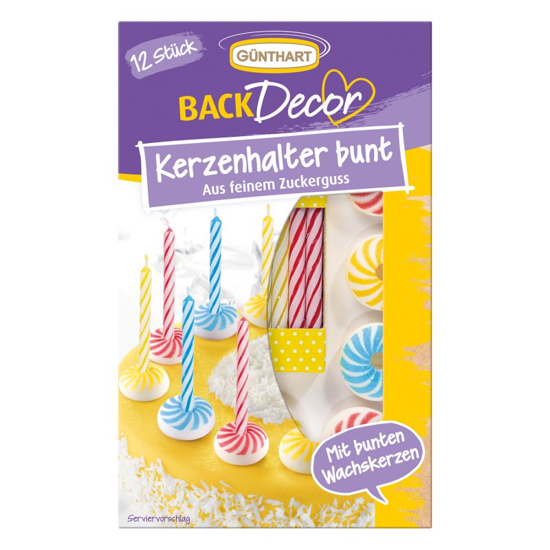 Zuckerkerzenhalter mit Kerzen. 12 Stück in der Packung.