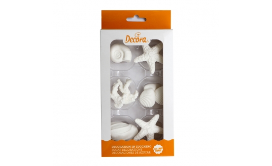 Zuckerdekorationen in Meeresfrüchte-Formen sind einsatzbereit. Sie werden von Hand hergestellt und enthalten natürliche Extraktionsfarbstoffe. Ideal zum Dekorieren von Kuchen, Cupcakes und anderen Desserts. Diese Dekorationen sind bereits fertig, eine weitere Bearbeitung ist nicht erforderlich.