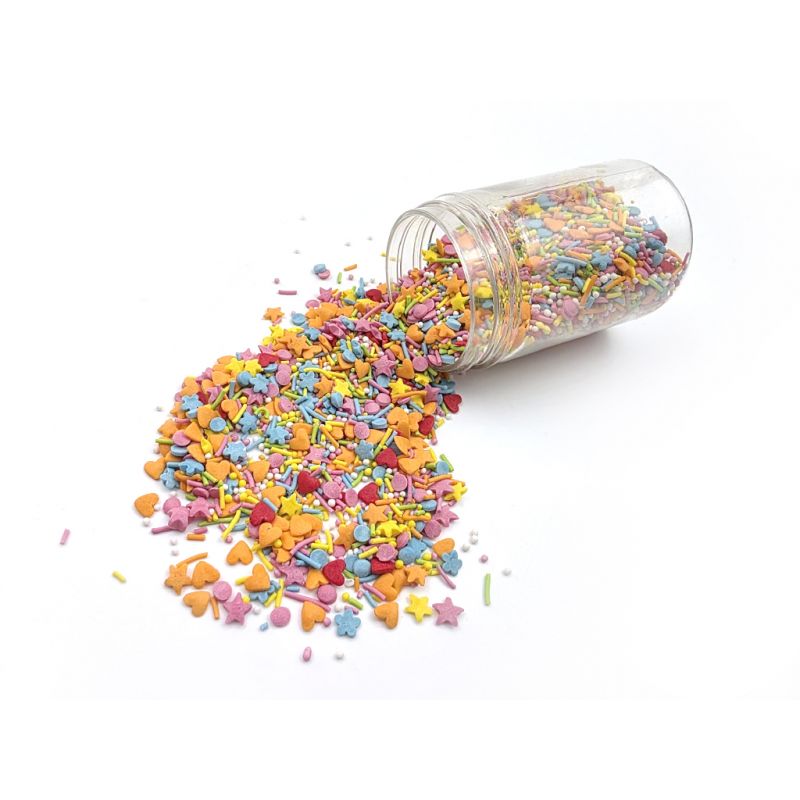 Gehen Sie mit diesem bunten Zuckerstreuungsschaum zu den Wirbeln des Karnevals. Wunderschöne Zuckerdekorationen I LOVE CAKES in verschiedenen Formen helfen Ihnen auf interessante Weise, Muffins, Kuchen, Torten, Desserts, Cake Pops, Kekse und weitere Süßigkeiten zu verzieren. Die Streuungen werden eine schöne Verzierung von Backwaren für verschiedene Partys, Jubiläen oder eine Geburtstagstorte sein. Zuckerkörner eignen sich beim Vorbereiten von Süßigkeiten für ein süßes Buffet. Zuckerkornverzierungen sind in einer praktischen Dose verpackt, damit sie leicht dosiert und aufbewahrt werden können. An einem kühlen, trockenen Ort außerhalb der Sonneneinstrahlung lagern. Wenn Sie die Verzierung auf eine weiche Creme streuen, kann Feuchtigkeit die Streuung erweichen. Aber Vorsicht: Wenn die Verzierung längere Zeit auf einer feuchten Creme liegt, kann sich aus der Streuung auch Farbstoff lösen und auf der Oberfläche der Creme erscheinen. Wenn Sie möchten, dass größere Teile der Dekoration beispielsweise auf einer glasierten Torte haften, können Sie diese Art der Verzierung an Torten mit halbtrockener Schokolade oder Zuckerguss auf Lebkuchen befestigen. Arbeiten Sie mit den Streuungen am besten über einer Schüssel oder einem Backblech mit Rand.
