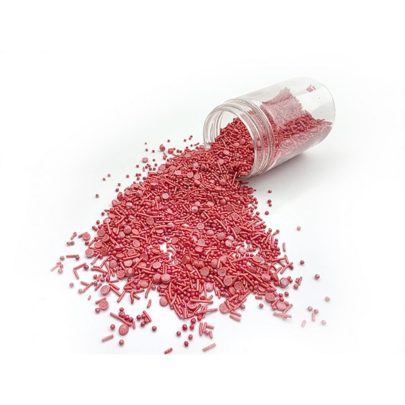 Mit diesem Zuckstreuseln in feurigen Farben erwecken Sie Kuchen und Cupcakes für jeden Party, Gartenfest usw. zum Leben. Wunderschöne Zuckerdekorationen I LOVE CAKES in verschiedenen Formen helfen Ihnen, Muffins, Kuchen, Torten, Desserts, Cake Pops, Kekse und weitere Süßigkeiten auf interessante Weise zu verzieren. Die Streusel werden eine schöne Verzierung für Backwaren zu verschiedenen Partys, Jubiläen oder Geburtstagskuchen sein. Zuckstreusel eignen sich gut, wenn Süßspeisen für einen Festtagstisch vorbereitet werden. Es handelt sich um eine Mischung aus Zuckstreuseln. Sie sind in einem praktischen Behälter verpackt, der eine einfache Dosierung und Lagerung ermöglicht. Bewahren Sie sie an einem kühlen, trockenen Ort, fern von direkter Sonneneinstrahlung, auf. Wenn Sie die Verzierung auf eine weiche Cremeschicht streuen, kann die Feuchtigkeit sie weicher machen. Aber Vorsicht: Wenn die Verzierung zu lange auf der feuchten Creme liegt, kann sich Farbstoff aus dem Streusel lösen und auf die Oberfläche der Creme gelangen. Wenn Sie möchten, dass größere Teile der Deko beispielsweise auf einer Glasur-Torte haften, können Sie diese Art der Verzierung mit halttrockener Schokolade oder Zuckerguss auf Lebkuchen befestigen. Arbeiten Sie mit Streuseln vorzugsweise über einer Schüssel oder einem Backblech mit Rand.