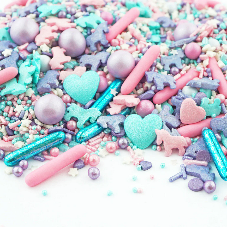 Die Mischung aus Streuseln wird nicht nur kleine Mädchen begeistern, die Einhörner lieben. Neben rosafarbenen Einhörnern finden Sie auch Stücke von Riesenherzen, Konfetti und glitzernde Zuckerstreusel. Außerdem gibt es eine ordentliche Portion Schokoladenkugeln in lila, blau und rosa Zuckerstangen.