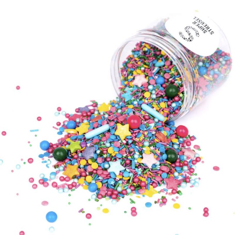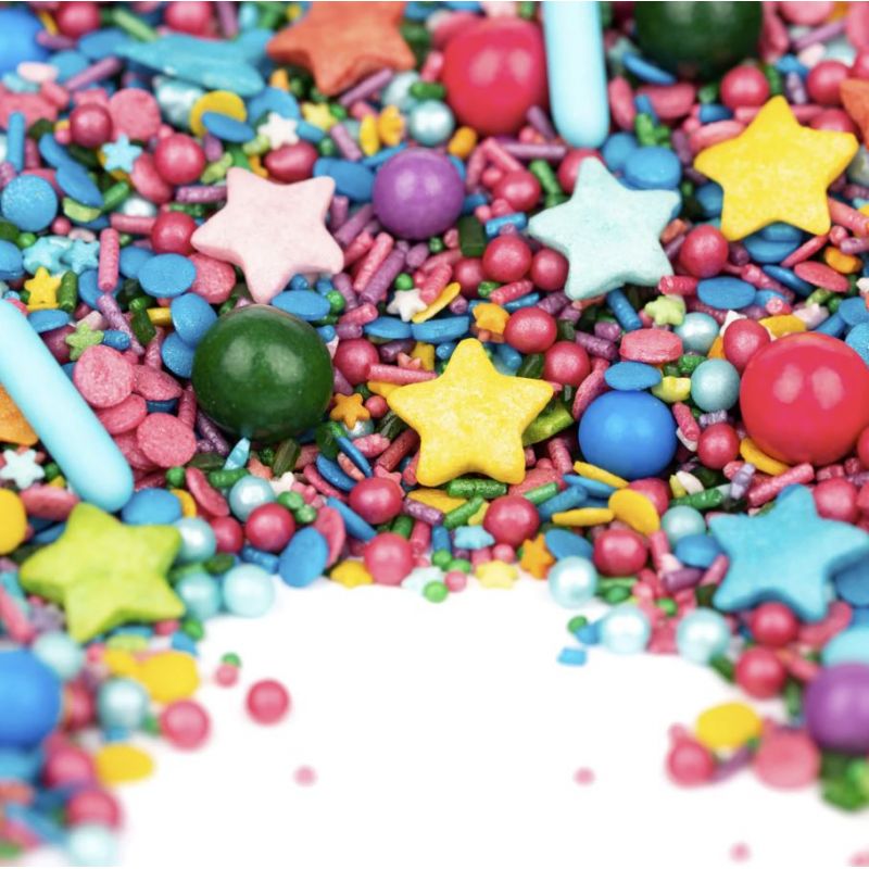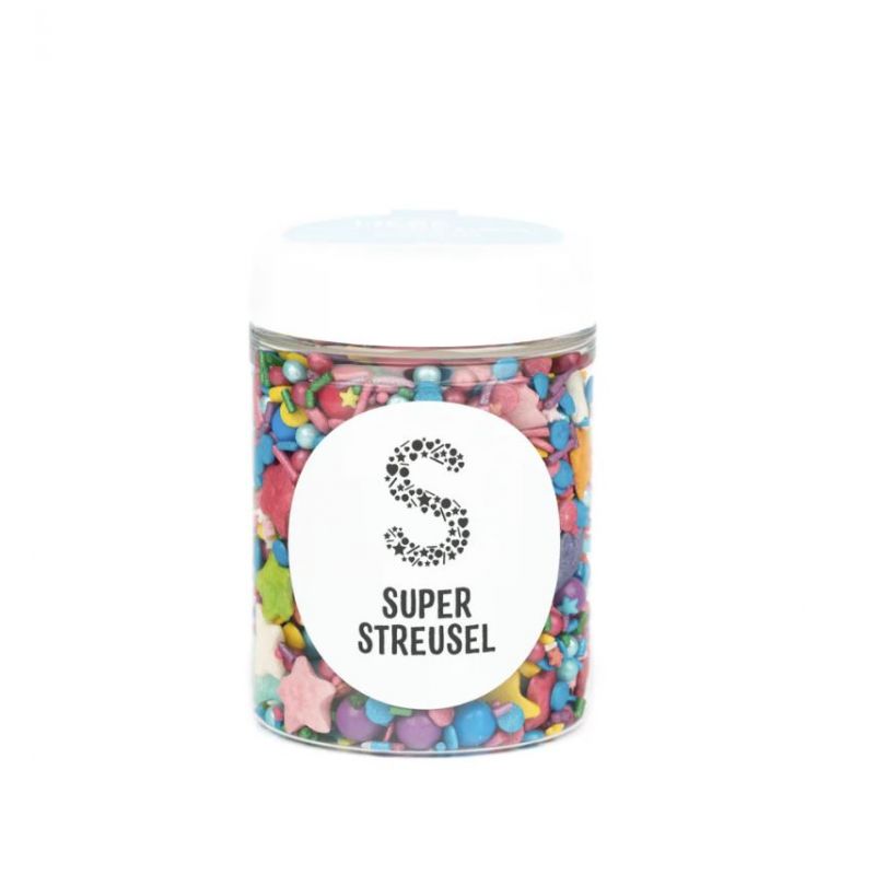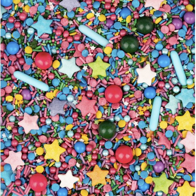 Der super galaktische StreuselMix Star Rain landet wie eine kleine Sternschnuppe in Ihrer Küche und verwandelt Ihre Torten in die buntesten der Welt. Große und kleine Astronauten werden staunen, wenn sie auf dem nächsten Kindergeburtstag Ihren Planeten-Kuchen im Weltraum-Stil entdecken. Jubelschreie sind vorprogrammiert - nur bitte anschnallen und nicht gleich auf dem Weg zum StreuselHimmel abnehmen. Der SternenRagen kommt völlig losgelöst vom Boden mit kleinen und großen Sternen, großen und kleinen Schokokugeln, Konfetti und Perlenstreuseln - alles in knalligen Farben wie blau, grün, gelb, lila, orange und natürlich einer Extraportion rosa. Die länglichen Riegel enthalten dünne, rohe Nudeln, die mit Zucker überzogen sind. Sie gehören zwar zu den hübschesten, aber auch zu den schwersten unserer Mischungen. Genießen Sie sie also mit Bedacht. Kugeln: Unsere mittleren und großen Kugeln sind alle köstlich mit feiner Schokolade oder knusprigem Crunch gefüllt. Lecker! Umrühren: Während des Versands fallen die großen Streusel- und Schokoladenkugeln normalerweise in die Mitte der Dose. Um in den Genuss der vollen Streuselpracht zu kommen, kippen Sie die Dose einfach in eine Schüssel und lassen Sie den Genuss auf sich wirken. Zutaten: Zucker, Glukose, Weizenstärke, Kartoffelstärke, Glukosesirup, Sonnenblumenöl, Reismehl, Pflanzenöl (Kokosnuss), Milchschokolade [Zucker, Kakaobutter, Vollmilchpulver, Kakaomasse, Emulgator: Sojalecithin, natürliches Vanillearoma ], Keksfüllung [Reismehl, Weizenmehl, Zucker, Weizenmalzmehl, Weizengluten, Salz], Weizenmehl, Stabilisator: Gummi arabicum, Zuckerester von Fettsäuren, Agar; Stärke (Reis/Mais), Kakaobutter, Farbstoffe: E120, E153, E172, E174; Veredelungsmittel: Schellack, Bienenwachs, Karnaubawachs; Kann Spuren von Nüssen enthalten. Energie: 1725 kJ/407 kcal; Fett: 3,2g, davon gesättigt: 1,6g; Kohlenhydrate: 93,6g, davon Zucker: 88,2g; Eiweiß: 0,8g; Salz: 0,02g