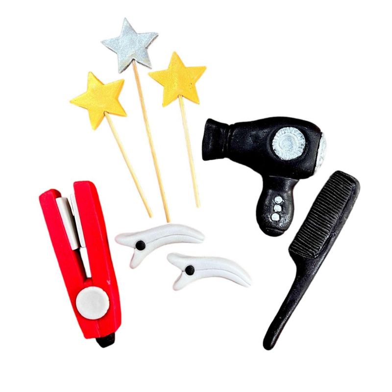 Zucker-Dekoration stellt ein Set Friseurzubehör dar. Perfekt dekorieren Sie damit eine Torte für Friseurinnen, Haarstylisten-Fans und kleine Mädchen. Das Set enthält einen Kamm, einen Föhn, ein Glätteisen sowie Haarclips und Stecknadeln in Sternform. Hergestellt aus essbarem Marzipan. Föhn (1 Stk) – 8,5 x 2 x 8,5 cm Kamm (1 Stk) – 12,5 x 0,5 x 2,5 cm Glätteisen (1 Stk) – 11 x 1,5 x 4 cm Haarclips (2 Stk) – 6 x 1 x 2,5 cm Sterne (3 Stk) – 4 x 0,5 x 3 cm