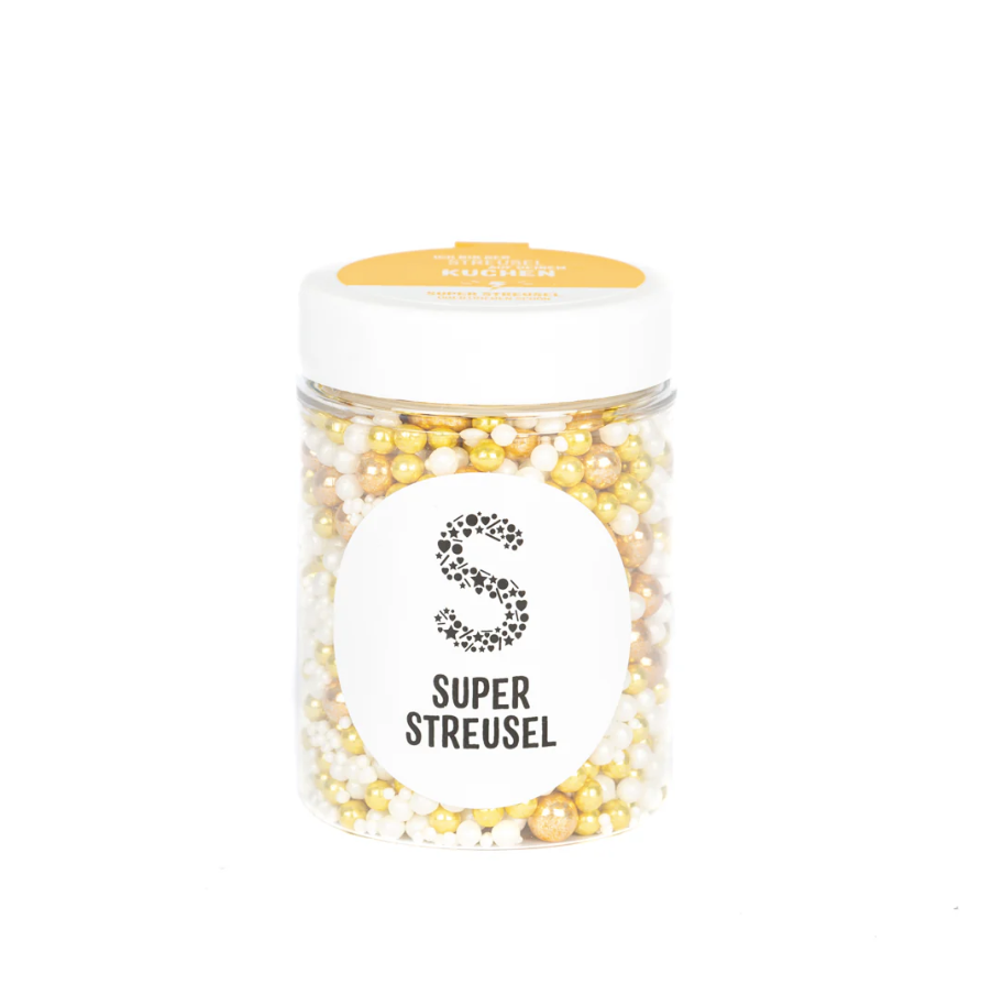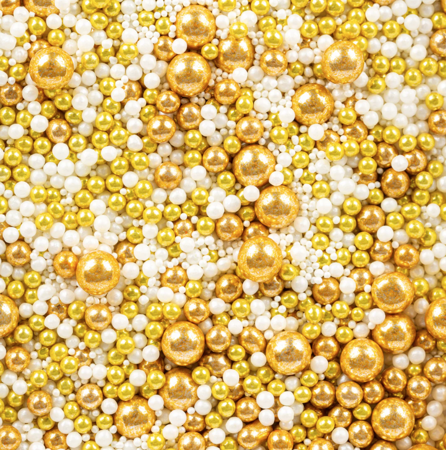 Goldfimmer gold-weiße Zuckerdekorperlen. 90 g Packung.