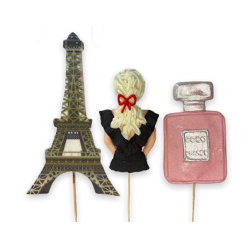 Drei Zuckerhalter mit Motiv Parfum, Eiffelturm und blonde Mädchen. Zuckerstäbchen/dessertstich dekorieren Kuchen, Rollen oder Muffins.