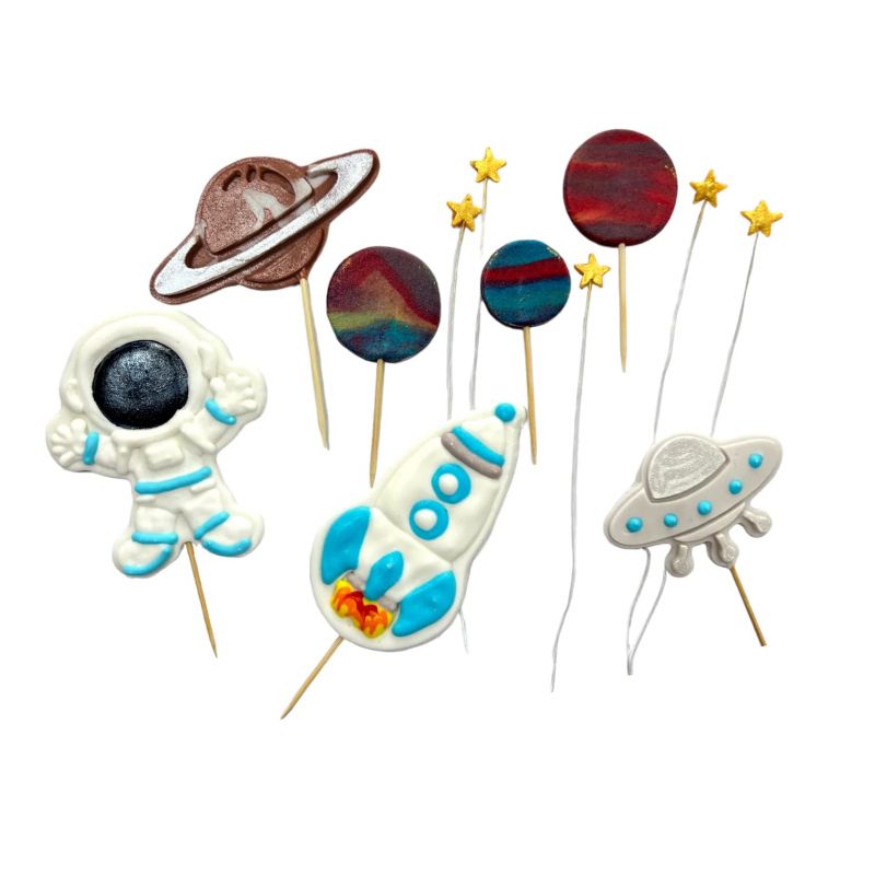 Zuckerfigur mit Motiv des Weltraums, ideal zur Verzierung von kleinen und mittelgroßen Kuchen sowie anderen gelegentlichen Backwaren für Mädchen. Er ist mit einem Stielchen versehen, damit er leicht an jedem Kuchen befestigt werden kann.