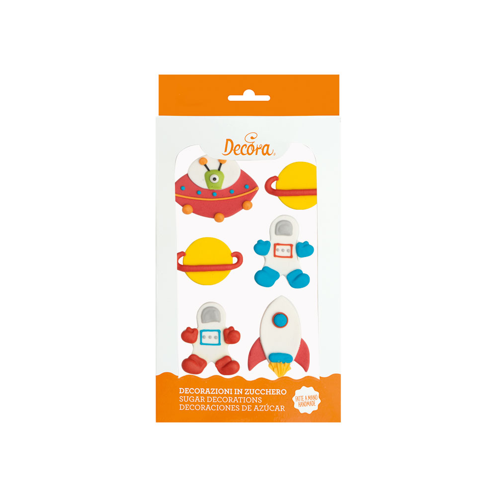 Zuckerdekorationen in Form von weltraumähnlichen Figuren, bereit für den direkten Gebrauch. Sie sind von Hand gefertigt, mit dem Einsatz natürlicher Farbstoffextrakte. Ideal zum Verzieren von Torten, Keksen und weiteren Desserts. Diese Dekorationen sind bereits fertig, eine weitere Bearbeitung ist nicht nötig. Die Figuren haben eine Größe von 3–5 cm.
