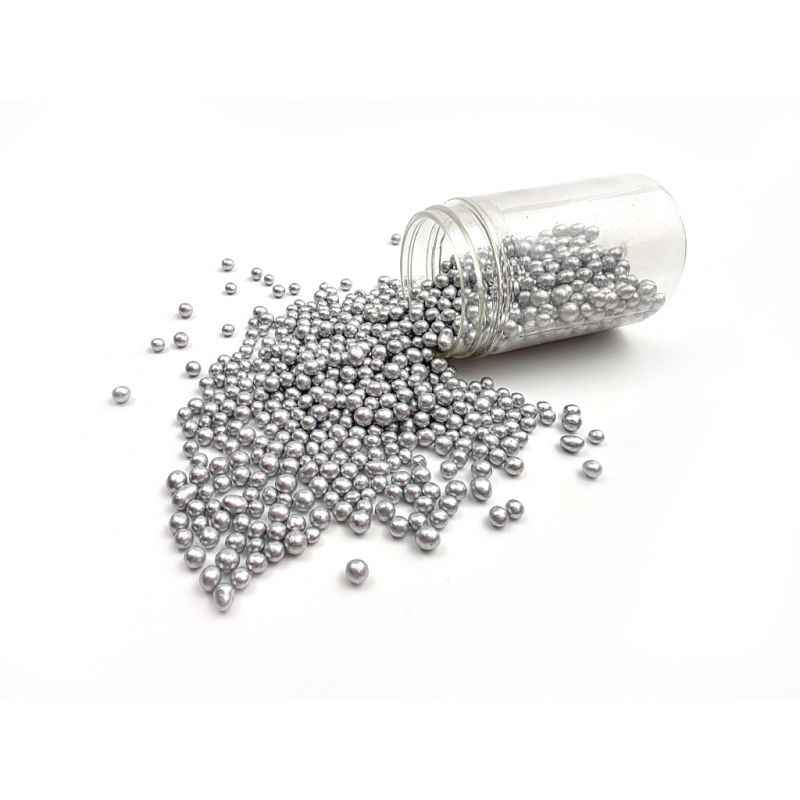 5 mm große silberne Perlen bestehen aus Reiskrugeln und Zucker. Sie eignen sich perfekt zum Dekorieren von Kuchen, Eis, Süßigkeiten und Lebkuchen. Entdecke den Zauber dieser Perlen, die jedes Dessert zu einem Kunstwerk machen. Sie sind mehr als nur Dekoration – sie sind feine Akzente, die deinen süßen Kreationen Glanz und Einzigartigkeit verleihen. Sie bestehen aus hochwertigsten Rohstoffen. Ihre Oberflächenbearbeitung ist ein innovativer Ansatz zur Dekoration, der sich von traditionellen essbaren Zierwerkzeugen abhebt. Wenn du die Verzierung auf eine zarte Creme streust, kann Feuchtigkeit sie weicher machen. Aber Vorsicht, wenn die Verzierung länger auf der feuchten Creme liegt, kann sich aus dem Streuverkehr auch Farbstoff lösen und auf der Oberfläche der Creme landen. Wenn du willst, dass größere Teile der Dekoration beispielsweise auf einer Fondant-Torte haften, kannst du diese Art der Dekoration mit halbtrockenen Schokoladen oder Zuckerguss für Lebkuchen befestigen. Arbeite beim Streuen möglichst über einer Schüssel oder einem Backblech mit Rand.