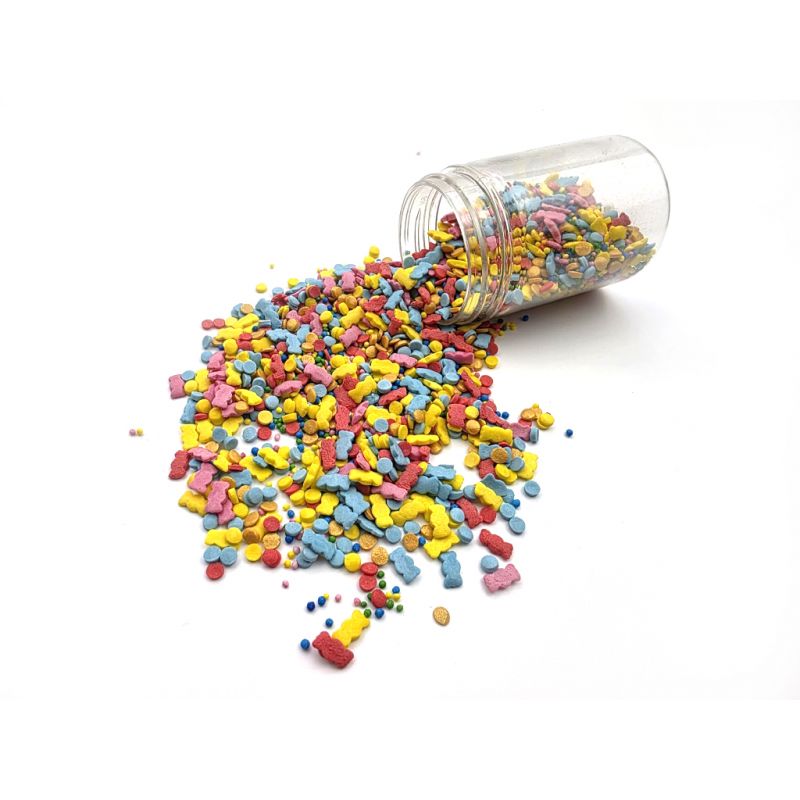 Gehen Sie mit diesem bunten Zuckerdekor zu den Wirbeln des Karnevals. Die schönen Zuckerdekore „I LOVE CAKES“ in verschiedenen Formen helfen Ihnen auf interessante Weise, Muffins, Torten, Kuchen, Desserts, Cake Pops, Kekse und weitere Süßigkeiten zu verzieren. Die Dekore werden eine schöne Verzierung des Backwerks für verschiedene Partys, Jubiläen oder eine Geburtstagstorte sein. Zuckerdekore eignen sich beim Zubereiten von Süßspeisen für eine süße Tafel. Zuckerdekore sind in einer praktischen Dose verpackt, damit sie leicht portioniert und aufbewahrt werden können. An einem kühlen, trockenen Ort außerhalb von direktem Sonnenlicht lagern. Wenn Sie die Verzierung auf einen zarten Frischkäse streuen, kann Feuchtigkeit aus ihm das Dekoriteil erweichen. Aber Vorsicht: Wenn die Verzierung länger auf dem feuchten Kuchen bleibt, kann sich auch der Farbstoff aus dem Dekor lösen und sich auf der Oberfläche des Crèmes absetzen. Wenn Sie möchten, dass größere Teile der Dekoration beispielsweise auf einer glasierten Torte haften, können Sie diese Art von Verzierung mit Zartbitterschokolade oder Zuckerguss für Lebkuchen befestigen. Arbeiten Sie möglichst über einer Schale oder einem Backblech mit Rand.